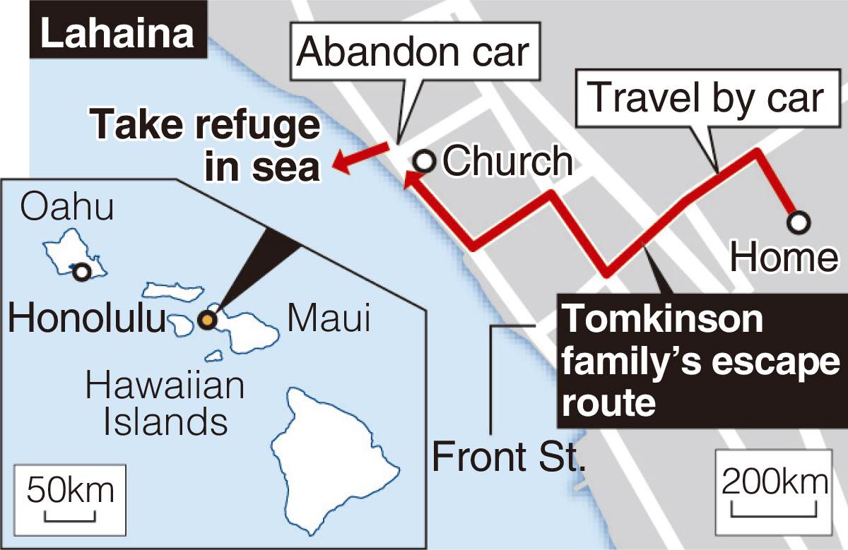 LAHAINA, Hawaii — A 19-year-old man and his family survived the flames of wildfire on the island of Maui in Hawaii by jumping into the sea and spending five hours in the water. Noah Tomkinson, who cheered up his younger brother and kept his mother warm while spending time in the sea told The Yomiuri Shimbun about the scary moments when the fire was closing in on them in darkness.