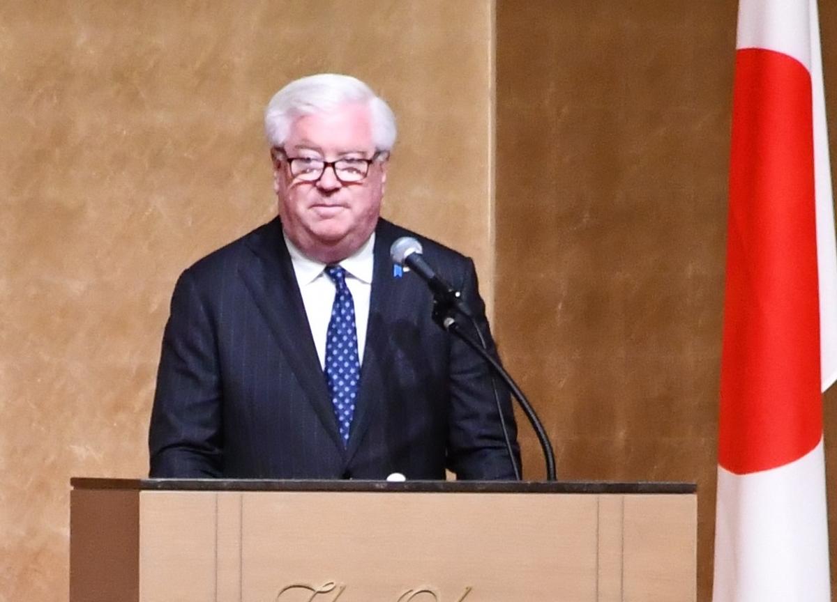 U.S. Ambassador George Glass gives a speech at a reception in Tokyo on Friday.