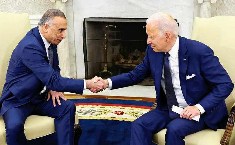 U.S. President Joe Biden greets Iraq’s Prime Minister Mustafa Al-Kadhimi, left, during a bilateral meeting in the Oval Office at the White House in Washington on July 26, 2021.