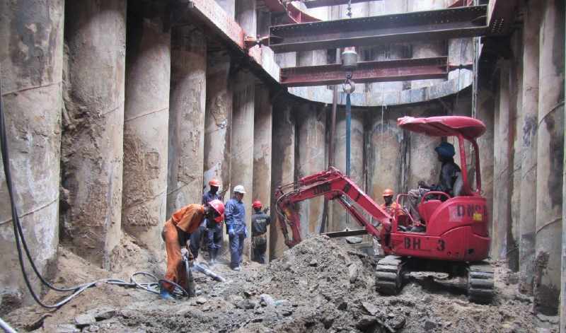 Construction workers work seven meters below the water surface of Nile River to build the foundation of the Freedom Bridge in Juba.