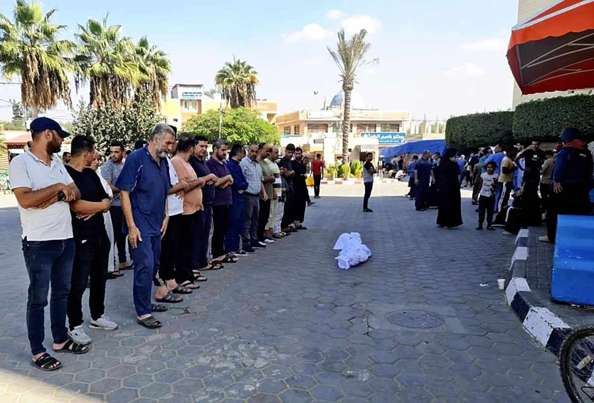 Residents pray for those killed in air strikes at a hospital in Deir al-Balah, Gaza Strip, on Tuesday.