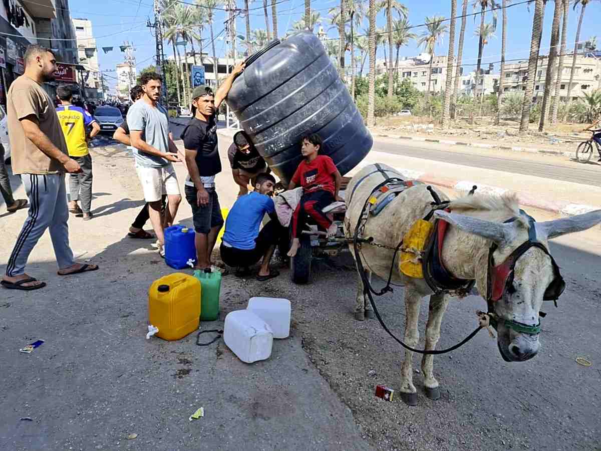 A donkey is used to tow a tank of water on a street in Deir Al-Balah in central Gaza Strip.