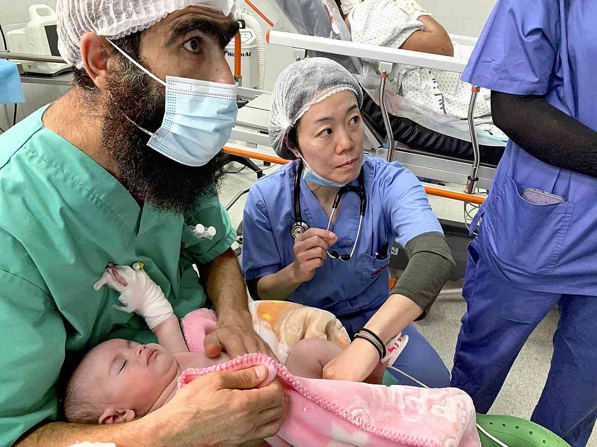 Physician Yuko Nakajima, center, examines an injured infant in an operating room in Khan Yunis, Gaza, on Nov. 20.