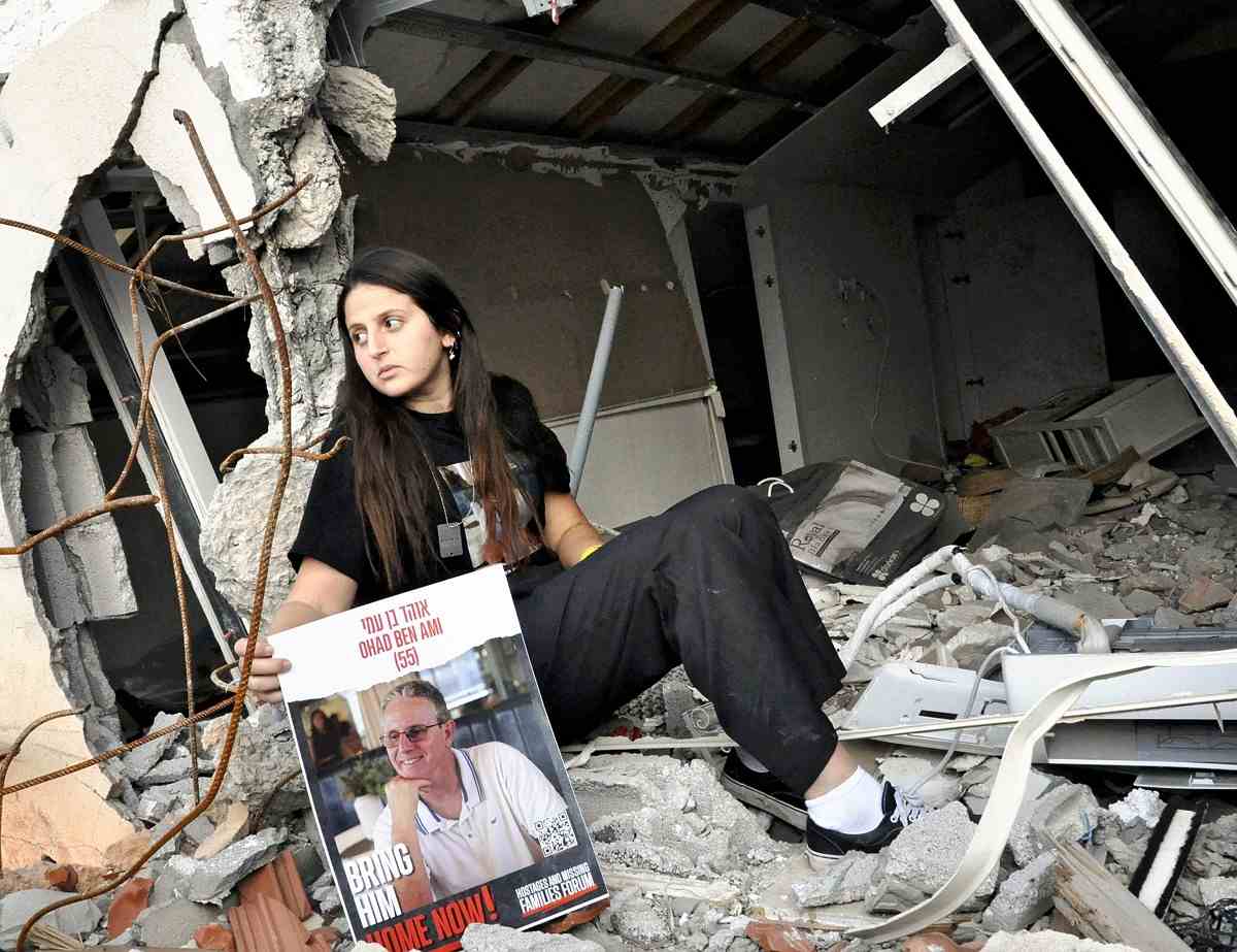 Ella Ben Ami calls on Dec. 20 for her father’s immediate release by Hamas, at her destroyed family home in Kibbutz Be’eri, southern Israel.