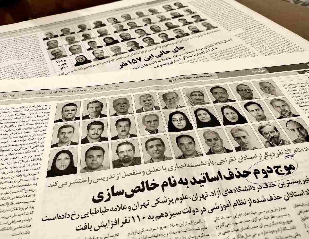 Copies of August issues of the Etemad newspaper with photos of professors who were dismissed from their posts.